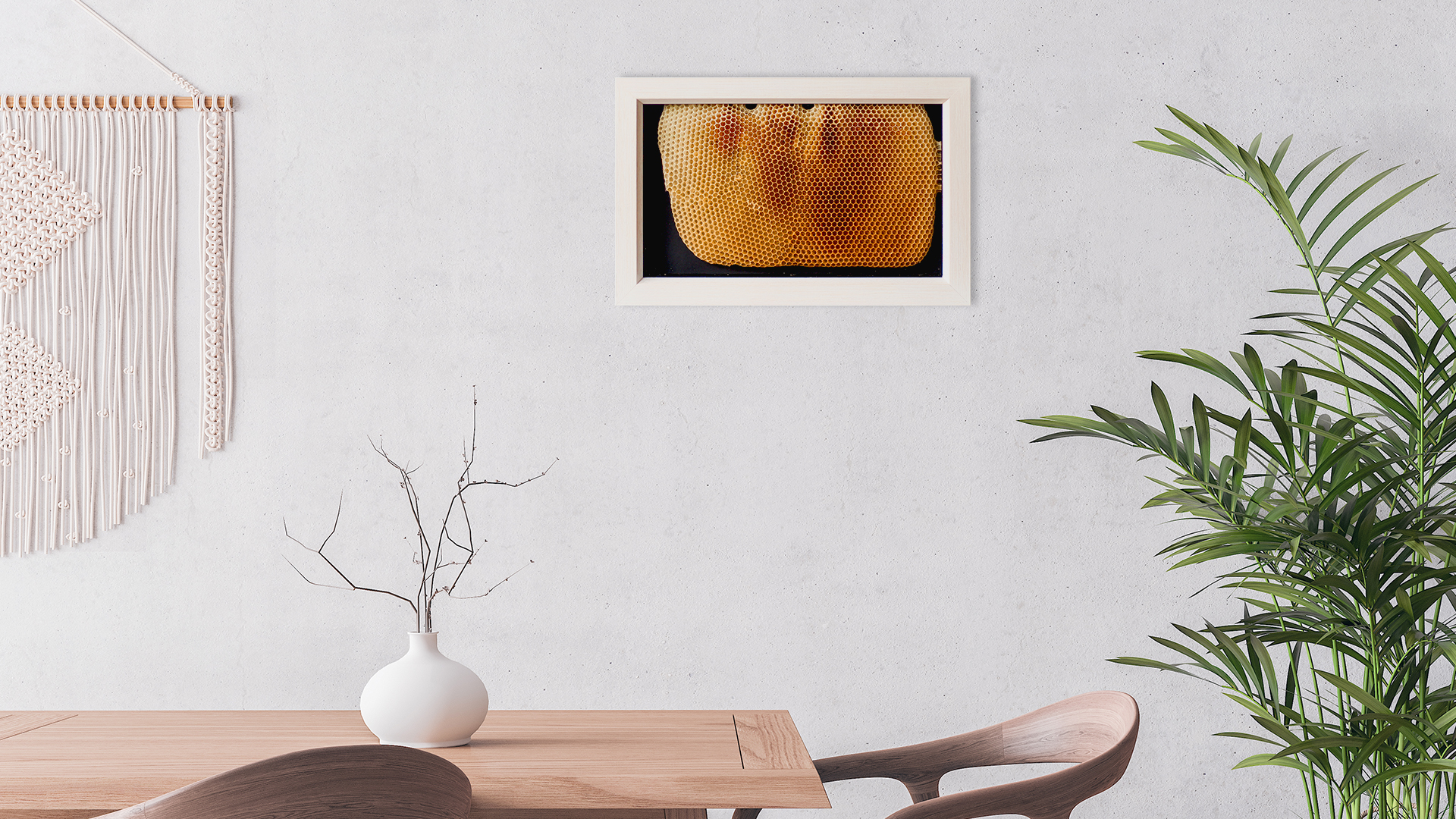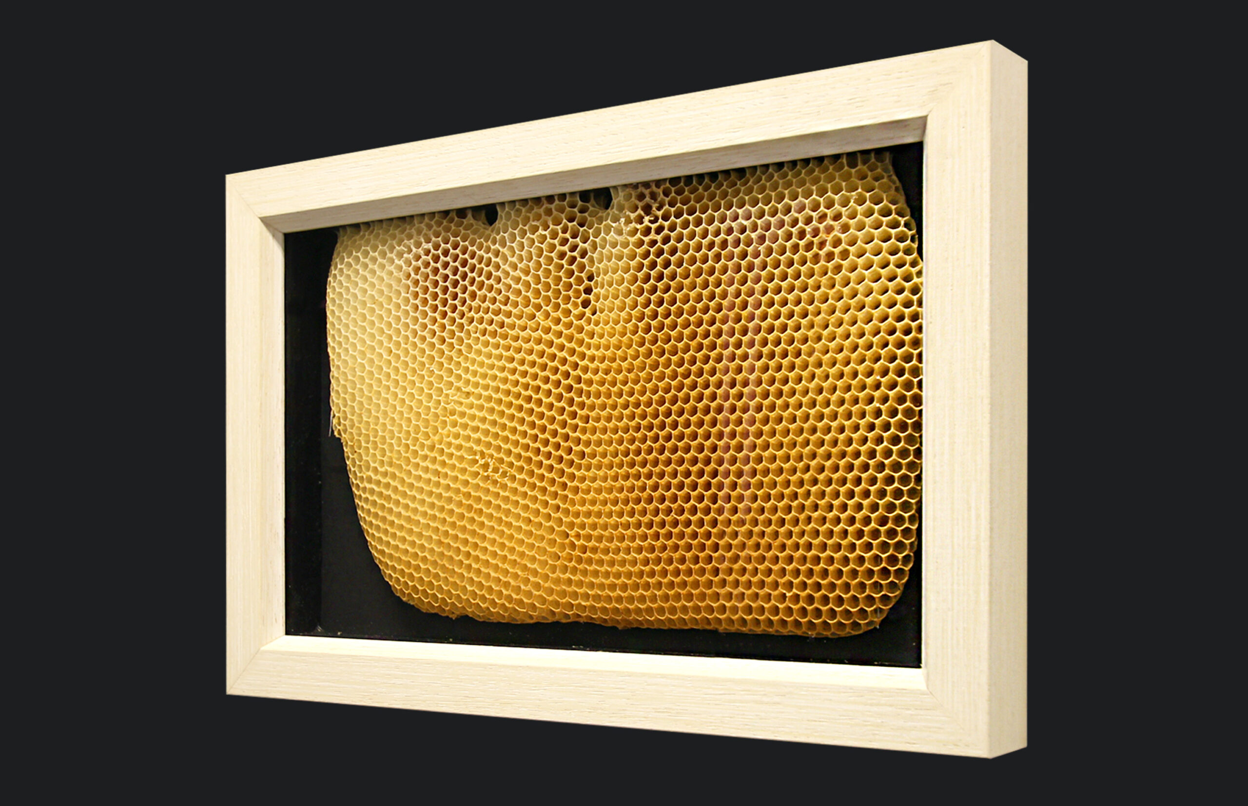 Hladký dřevěný rám v bilém provedení s jemnými rýhami, rovného tvaru s mírným zkosením na vnitřní hraně obrazu. Zadní výplň v odstínu tmavě černé barvy.